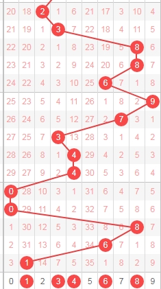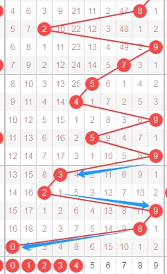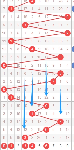 上图是体彩七星彩开奖号码分布图从左到右的第四位数字,我在上图中标注出来的数字是觉得可以关注的,因为关注这几个数字?看看我画的蓝色箭头就会发现,最近开出的跨度大的走势多,那么本期我觉得应该关注跨度小的数字,所以关注数字0 1 2 3 4。