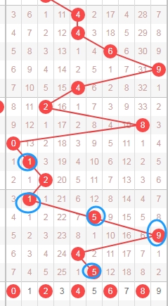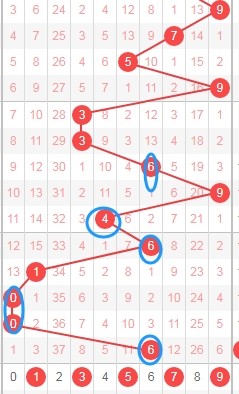 上图是体彩七星彩开奖号码分布图从左到右的第三位数字,我在上图中标注出来的数字是觉得可以关注的,标注出来的数字是所有奇数,因为最近开出的偶数比较多,上面我用蓝色圈圈标注出来的都是偶数,那么上面偶数多,那么本期奇数的概率大,关注数字1 3 5 7 9。