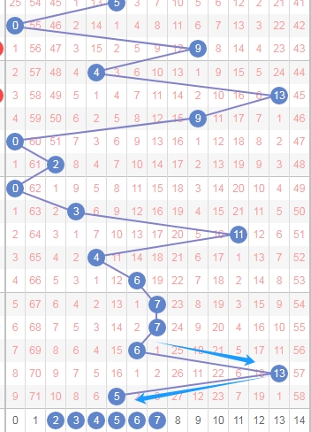 上图是体彩七星彩开奖号码分布图从左到右的第六位数字,我在上图中标注出来的数字是觉得可以关注的,因为这几个数字的遗漏周期小,我在上面图中用蓝色箭头标注出来的数字,你们看看这些遗漏周期是不是大,那么本期关注遗漏周期小的数字0 1 3 4 6。