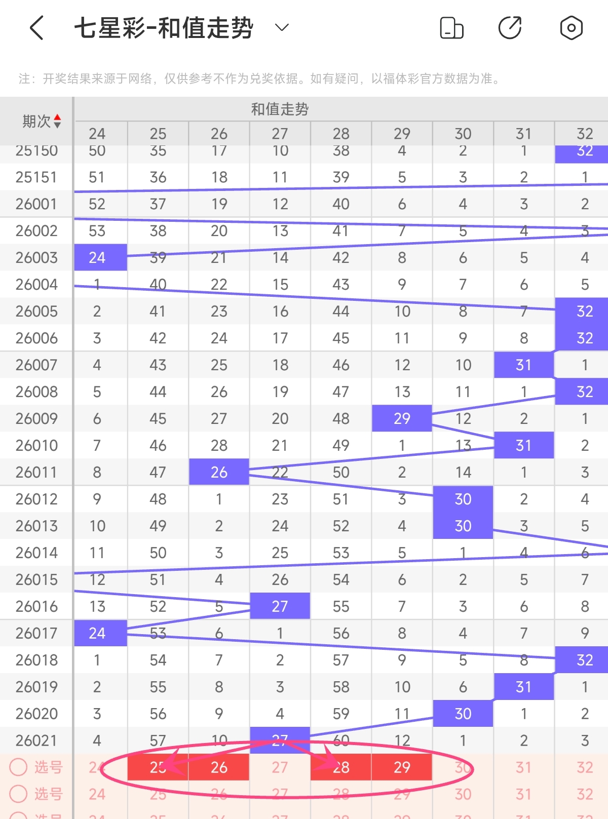 近期和值多在24-32区间波动,预计本期和值会继续在这个范围内开出,预计本期号码可以重点考虑这个范围和值来组号。