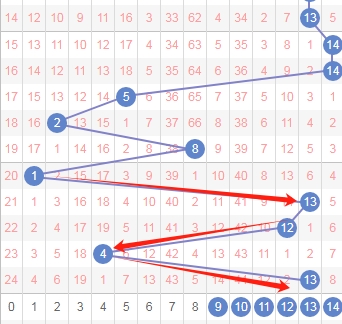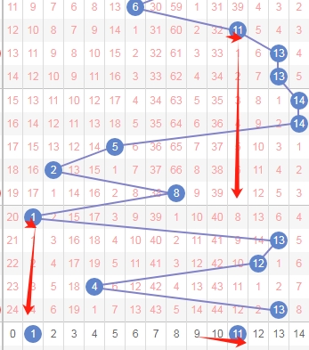 上图是体彩七星彩蓝球开奖号码走势分布图,我标注出来红色箭头表示最近开出的走势跨度,最近两期跨度都是大的,那么本期可以关注出跨度小的数字9 10 11 12 13 14。