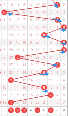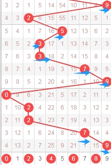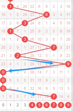 上图是体彩七星彩蓝球开奖号码走势分布图,我标注出来红色箭头表示0尾数数字0 10,很明显发现0尾数数字已经连续遗漏了24期,那么本期或者近期大家要留意一下0尾数的数字。