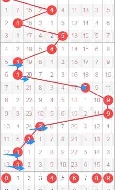 上图是体彩七星彩蓝球开奖号码走势分布图,我标注出来红色箭头表示蓝球1尾数的数字1 11到本期为止1尾数数字已经连续遗漏了4期上次是连续遗漏了7期,那么本期或者近期大家要留意蓝球1尾数数字。