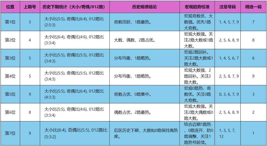 3. 本期指标推演:奇偶比推荐:4:2。延续近期奇数优势。大小比推荐:4:2。大数趋势依然强劲,但上期大小比为4:2,已从极端值5:1回落,预计维持4:2的强势均衡。012路比推荐:3:2:1。在0路热度温和回落、2路稳步回补的背景下,维持0路为主导(3个),1路稳定输出(2个),2路继续回补(1个)的格局。和值参考:28-36。延续中高位和值区间。跨度参考:7或8。关注高频跨度。