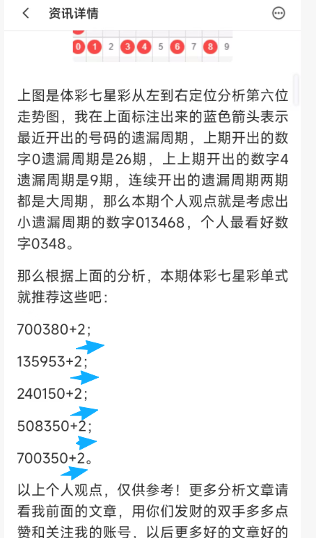 上图是上期体彩七星彩号码分析文章截图,我最后推荐的5组单式中,蓝球是一码猜对蓝球2的,这个你们自己去看上期的文章分析吧。下面继续来分析体彩七星彩第2026019期的号码,先分析蓝球。