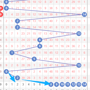 上图是体彩七星彩蓝球开奖号码走势分布图,我在上面走势图中标注出来的数字是我觉得蓝球号码的范围,本期蓝球数字看好8 9 10 11 12  13 14,为什么要看这些数字呢?因为上期开出的蓝球2是从蓝球0走过去的,跨度是2,走势跨度2是小跨度,而且很小的跨度,那么本期开大跨度的走势的机会就有了,假设本期蓝球出大跨度走势的话,那么就是范围8 9 10 11 12 13 14。