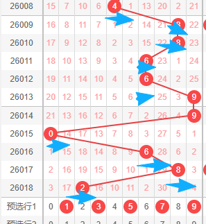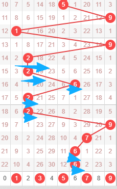 上图是体彩七星彩从左到右定位分析的第二位数字走势图,我在上面走势图中标注出来的数字是我觉得第二位数字范围,这些数字你们看看蓝色竖向箭头,这个区域的数字最近十几期出号码不多,还有上期开出的跨度是9,属于大跨度走势,那么本期开小跨度走势的号码机会就大了,假设出小跨度的话,那么范围就是数字56789,个人最看好数字569。