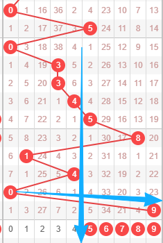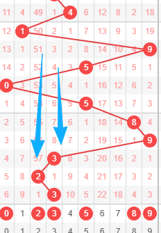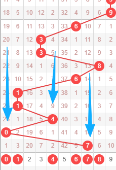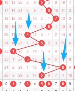 上图是体彩七星彩从左到右定位分析的第五位数字走势图,我在上面走势图中标注出来的数字是我觉得第五位数字范围都是遗漏周期小的数字13568,你们看看上面走势图标注出来的蓝色大箭头,最近开出的遗漏周期大的数字多,那么本期关注遗漏周期小的数字13568,个人最看好数字136。
