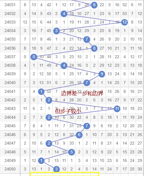 根据近期走势,本期考虑继续边界及以内、走折线边界差一步、到边界,根据近5期考虑步子变小,结果是:0~8