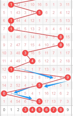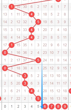 上图是体彩七星彩从左到右第五位走势图,我在上面走势图中标注出来的数字01234把这些数字当成一个区域的话,你们看我在上面走势图中标注出来的蓝色大箭头就知道,最近这个区域出号码不多,应该是最近十几期这个区域出号码不多,本期继续关注这个区域的数字01234,个人最看好数字024。