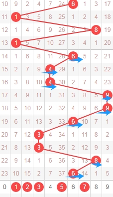 上图是体彩七星彩从左到右第二位走势图,从号码区域来分析的话,我在上面走势图中标注出来的数字6789把这几个数字当成一个区域,你们看这个区域的数字已经连续13期没出现号码,那么本期个人观点就是第二位关注这个区域的数字6789,个人最看好数字789。