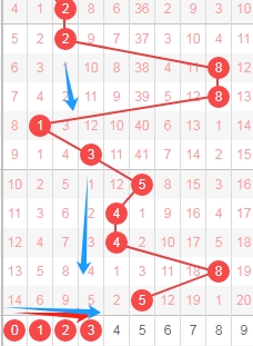 上图是体彩七星彩从左到右定位第一位走势图,我在上面走势图中标注出来的数字0123,把这四个数字当成一个区域来看。你们看上面走势图中画出来的蓝色箭头就知道,这个区域已经连续5期没出现号码,那么本期这个区域的数字开出的机会就大,所以本期第一位数字关注0123。
