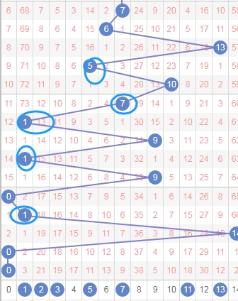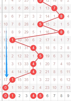 上图是体彩七星彩从左到右定位第二位走势图,我在上面走势图中标注出来的数字0145是我看好的,因为你们看上面走势图中标注出来的蓝色箭头就知道,上期这位数字开出数字0的遗漏周期是17期,那么本期开出遗漏周期小的数字的概率就大,所以本期这位数字看好遗漏周期小的数字0145。