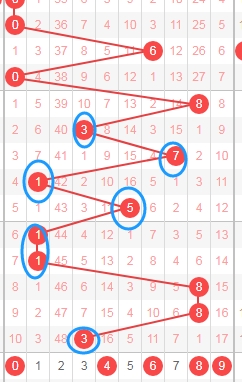 上图是体彩七星彩从左到右定位第四位走势图,我在上面走势图中标注出来的数字都是偶数02468,你们看上面走势图中用蓝色小圈圈表示的都是奇数,最近这位数字开出的奇数多,偶数少,所以本期这位数字应该关注出偶数的机会大,关注偶数02468。