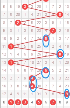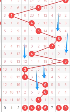上图是体彩七星彩从左到右定位第五位走势图,我在上面走势图中标注出来的数字都是遗漏周期小的数字345689,看上面走势图中画出来的蓝色箭头就知道,最近这位数字开出的遗漏周期大的居多,那么本期这位数字应该关注出遗漏周期小的数字34589。