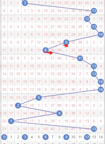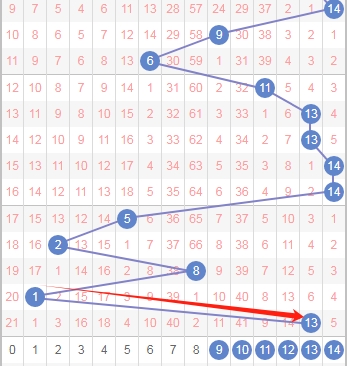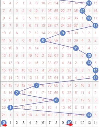 上图是体彩七星彩蓝球开奖号码走势分布图,我标注出来的红色箭头表示走势跨度,上期的跨度是从数字1到数字13跨度是12,属于大跨度,那么本期可以关注出小跨度的数字9 10 11 12 13 14。