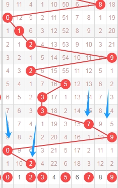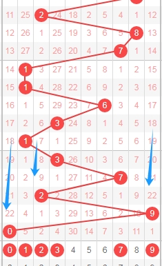 上图是体彩七星彩从左到右定位第一位数字,我标注出来的蓝色箭头表示遗漏周期,上期开出数字0遗漏周期是22期,最近几期开出的遗漏周期都是大的,那么本期可以关注出遗漏周期小的数字012379,个人最看好数字01237。