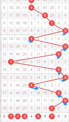 上图是体彩七星彩从左到右定位第五位数字,我标注出来的蓝色箭头表示遗漏周期,上期开出数字0遗漏周期是13期,根据这些遗漏周期来分析的话,那么本期第五位数字继续关注出遗漏周期小的数字0234579,个人最看好数字02479。