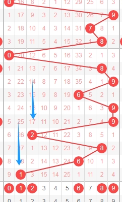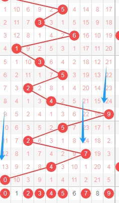 上图是体彩七星彩蓝球开奖号码走势分布图,我标注出来的红色小箭头表示蓝球0尾数数字0 10到本期为止0尾数蓝球已经连续遗漏了21期,那么本期或者近期大家还是要留意蓝球0尾数的数字。