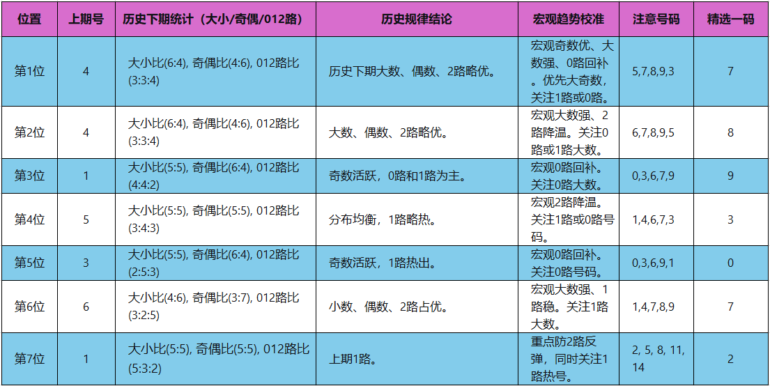 3. 本期指标推演:奇偶比推荐:4:2。长期奇数占优,且上期奇数3个,看好奇数适度反弹。大小比推荐:4:2。长期大数优势明确,近期大小均衡,看好大数回补。012路比推荐:3:2:1。基于近期2路过热、0路过冷的状态,看好 0路回补(给予3个),1路稳定(2个),2路降温(1个)。和值参考:25-33。预计从低位回升。跨度参考:6或7。关注中等跨度。