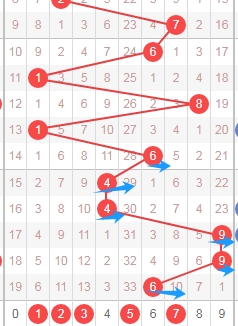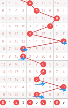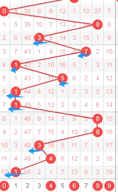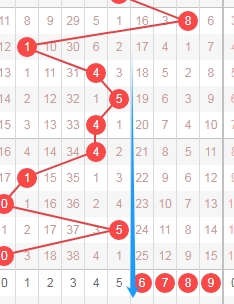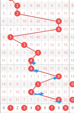 从冷热号码区域来分析,上图是体彩七星彩开奖号码走势图中从左到右第二位,我在上面标注出来的数字6789当成一个区域,看上面走势图中标注出来的蓝色大箭头就知道,最近蓝色大箭头的左边开出的号码多,右边开出的号码少,那么本期这位数字个人观点看好右边数字6789。