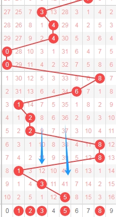 上图是体彩七星彩开奖号码分布走势图中从左到右定位的第一位数字,我在上面标注出来的数字是觉得可以关注的,因为你们看我画出来的蓝色箭头表示的遗漏周期,上期开出数字5遗漏周期是41期,那么前面开出遗漏周期大的走势,本期个人觉得应该可以去关注遗漏周期小的数字1 2 3 5 7。