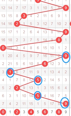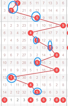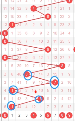 上图是体彩七星彩开奖号码分布走势图中从左到右定位的第三位数字,我在上面标注出来的数字是觉得可以关注的,因为你们看上面画出来的蓝色圈圈那些都是质数,最近连续开出了5期质数,那么本期个人觉得应该关注这位数字出合数0 4 6 8 9。