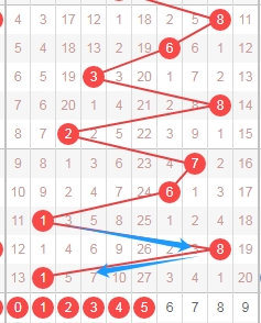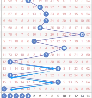 上图是体彩七星彩开奖号码分布走势图中从左到右定位的第六位数字,我在上面标注出来的数字是觉得可以关注的,因为你们看上面走势图中标注出来的蓝色箭头,最近开出的跨度都是大的,本期个人觉得这位数字应该关注出小跨度数字,这些数字是0 1 2 3 4 5。