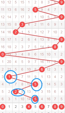 上图是体彩七星彩从左到右定位的二个数字分布走势图,我在上面走势图中标注出来的数字0 3 6 9个人觉得本期应该关注一下,为什么呢?因为这几个数字都是0路球数字,看上面走势图中出现的0路球数字可以发现的就是最近十几期内开出0路球数字少,那么本期第二个数字个人觉得可以关注出0路球数字。
