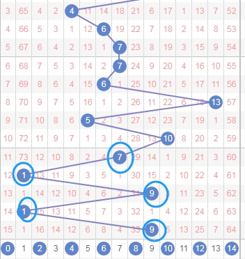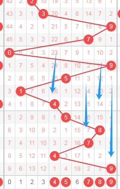 上图是体彩七星彩从左到右定位的五个数字分布走势图,我在上面走势图中标注出来的数字4 5 7 8 9个人觉得本期可以关注,因为你们看我在上面画出来的蓝色箭头就知道,最近开出的遗漏周期都大,那么本期可以关注一下那几个遗漏周期小的数字,刚好这几个数字4 5 7 8 9都是遗漏周期小的数字。