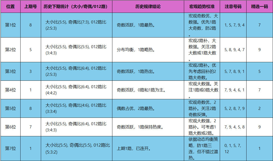本期策略:在完全均衡的格局下,不预设任何路数优势。重点关注:①温热号的延续;②冷号(尤其是0路冷号)的反弹。上期连开
