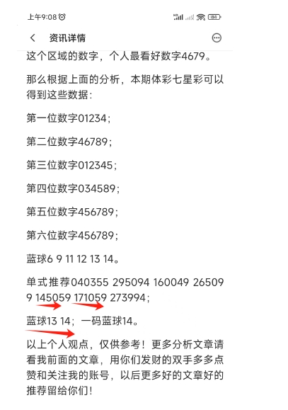 上图是上期体彩七星彩号码分析文章的截图,我最后推荐的单式中有两组分别都猜对3个,蓝球推荐13 14猜对蓝球13,也就是上期猜对了3+1。