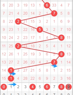 上图是体彩七星彩从左到右定位第一位走势图,我标注出来的蓝色小箭头表示质数数字,最近连续开出了3期质数数字,那么本期第一位数字可以关注出合数数字04689,个人最看好数字0468。