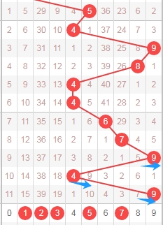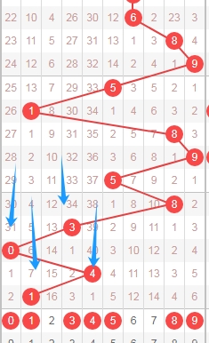 上图是体彩七星彩从左到右定位第四位走势图,我标注出来的蓝色大箭头表示遗漏周期,上期开出数字1遗漏周期是7期,上上期开出数字4遗漏周期是40期,那么根据这些遗漏周期来分析的话,本期第四位数字关注遗漏周期小的数字0134589,个人最看好数字01458。