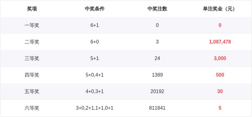 七星彩25106期开奖结果9 2 6 9 2 1 + 3,奇偶比3:3,和值29,质合比3:3,蓝球号码质合为质数。