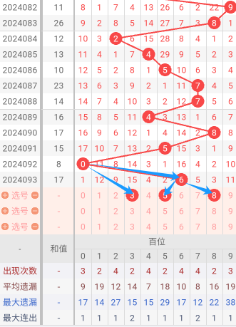现在我给大家分析下,本期百位可能开出的号吗,上期开出了6,根据走势图我们可以看到百位,083期开出了8号码球,084期开出了2号码球,085期开出了4号码球,086期开出了5号码球,087期开出来7号码球,088期开出了7号码球,089期开出了4号码球,090期开出了8号码球,091期开出了5号码球,092期开出了0号码球,093期开出了6号码球,根据这六期的走势和历史50期内的走势对比,我们可以先考虑本期可能会出大号,下面我给大家推存百位可能开出的几个号,个人比较看好358,百位我们就先暂定这两个号。本期关注3-8之间的号码,同时关注遗漏期数较小的号码。按最近遗漏走势,开了遗漏期数较小之后开遗漏期数大的可能性比较大。
