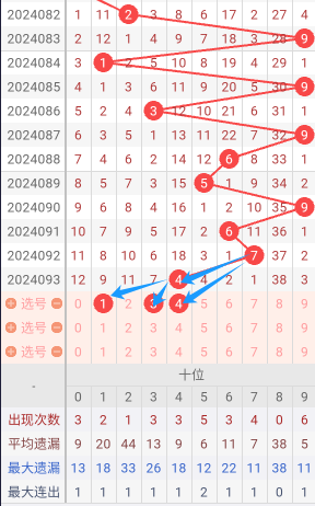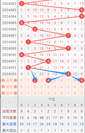 现在我给大家分析下,本期个位可能开出的号码,上期开出了7,083期开出了9号码球,084期开出了9号码球,085期开出了0号码球,086期开出了2号码球,087期开出了7号码球,088期开出了1号码球,089期开出了7号码球,090期开出了0号码球,091期开出了4号码球,092期开出了1号码球,093期开出了7号码球,根据这几期的走势和历史50期内的走势对比,我们可以先考虑本期可能会出小号,下面我给大家推存个位可能开出的几个号,个人比较看好249,个位我们就先暂定这两个号。本期重点关注2-9之间的号码,同时关注遗漏期数较大的号码。按最近遗漏走势,开了遗漏期数较大之后开遗漏期数小的可能性比较大。