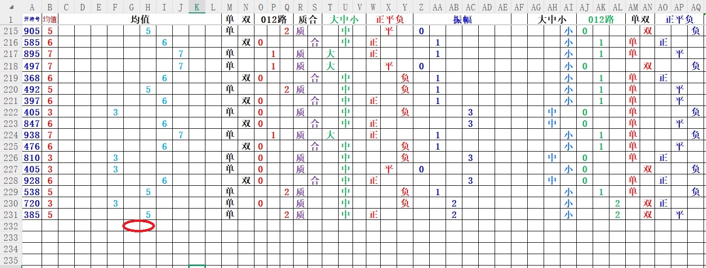 均值:就是开奖号每各数的总和除3,然后得到的余数,如果不够整除可以+1,-1,直到被整除得的数就是均值