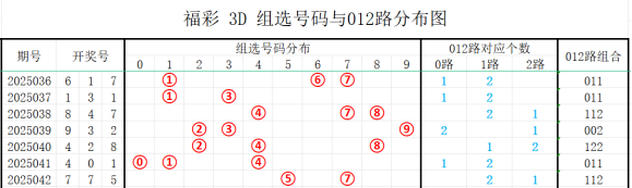 近7期(036~042)开奖号与012路组合分别为617(011)、131(011)、847(112)、932(002)、428(122)、401(011)、775(112),上期开奖号为112路组合,根据整体走势分析,本期看好的012路组合有:012、002、122、011,防022、001路组合。