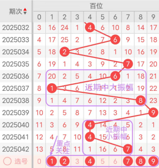 近7期(036~042)开奖号百位号码球分别为6、1、8、9、4、4、7,开奖号与上一期走出的振幅分别为1、5、7、1、5、0、3。036期走出6号中大数号码球,走出“1”的小幅度,037期走出1号小数号码球,走出“5”的中大幅度,038期走出8号大数号码球,走出“7”的大幅度,039期走出9号大数号码球,走出“1”的小幅度,040期走出4号中小数号码球,走出“5”的中大幅度,041期走出4号中小数号码球,走出“0”的小幅度,上期走出7号大数号码球,走出“3”的中小幅度;从振幅大小及走势图的整体形势来看,中大幅度走在5~6之间较为适宜,中小幅度走在0~3之间较为适宜;结合走势图的整体及大小走势分析,本期百位需重点关注号码球为1、2、4、7、8、9。