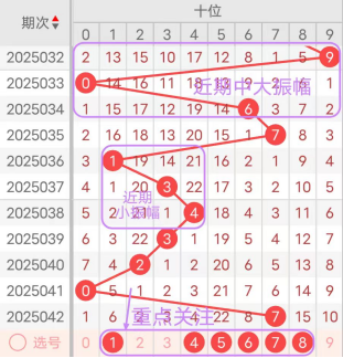 近7期(036~042)开奖号十位号码球分别为1、3、4、3、2、0、7,开奖号与上一期走出的振幅分别为6、2、1、1、1、2、7。036期走出1号小数号码球,走出“6”的中大幅度,037期走出3号中小数号码球,走出“2”的小幅度,038期走出4号中小数号码球,走出“1”的小幅度,039期走出3号中小数号码球,走出“1”的小幅度,040期走出2号小数号码球,走出“1”的小幅度,041期走出0号小数号码球,走出“2”的小幅度,上期走出7号大数号码球,走出“7”的大幅度;从振幅大小及走势图的整体对应来看,中大振幅走在3~6之间较为适宜,中小振幅走在0~2之间较为适宜;结合走势图的上下对应及振幅大小分析,本期十位应重点关注号码球为1、4、5、6、7、8。