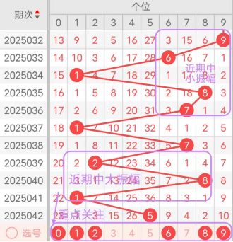 近7期(036~042)开奖号个位号码球分别为7、1、7、2、8、1、5,开奖号与上一期走出的振幅分别为1、6、6、5、6、7、4。036期走出7号大数号码球,走出“1”的小幅度,037期走出1号小数号码球,走出“6”的中大幅度,038期走出7号大数号码球,走出“6”的中大幅度,039期走出2号小数号码球,走出“5”的中大幅度,040期走出8号大数号码球,走出“6”的中大幅度,041期走出1号小数号码球,走出“7”的大幅度,上期走出5号中大数号码球,走出“4”的中小幅度;从近期振幅大小的走势及大小走势来看,中大振幅走在4~5之间较为适宜,中小振幅走在1~3之间较为适宜;结合走势图的整体及大小走势分析,本期个位应重点关注号码球为0、1、2、6、8、9。