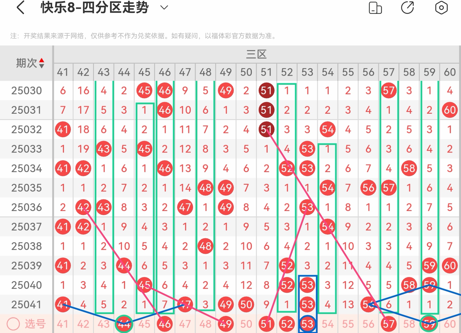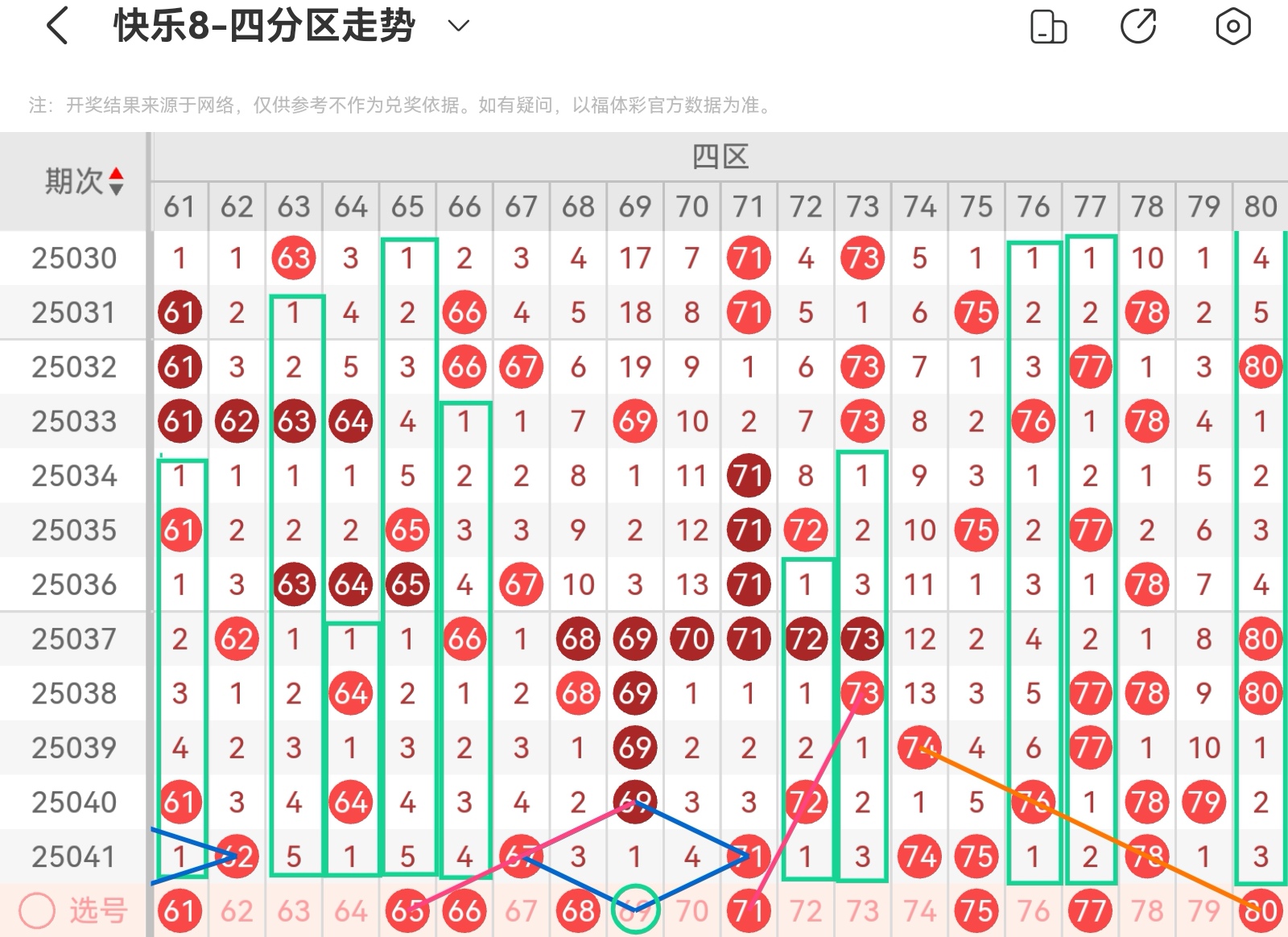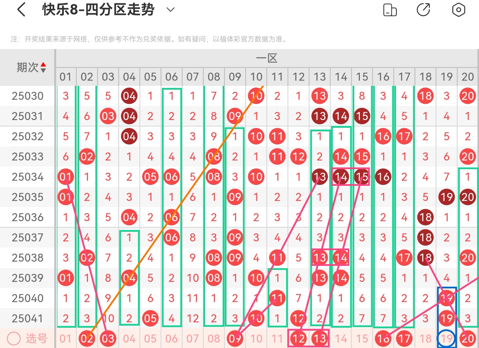 大家好,我是甜丝丝的坏事,主要以快乐八的形态走势、空位走势、遗漏走势以及斜连走势相结合的方法,用公认的四分区走势来进行预测分析,希望能让你有所收获。