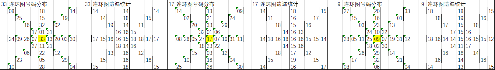 由于数据量大,不一一统计,下图为各个号码分别在33、17、9连环图上的遗漏统计汇总图: