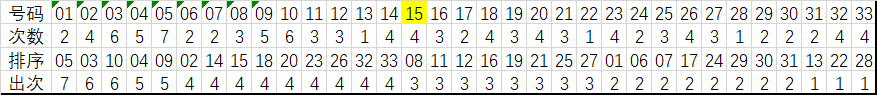 以上是遗漏大于16的号码分别在33、17、9连环图的分布,按照九转连环图选号规律,选取这些号码“环上”和“轴上”的相邻号码作为胆码,把这些胆码进行次数统计即可形成我们组号的排序,从出次多到少进行取号得出我们的大底。