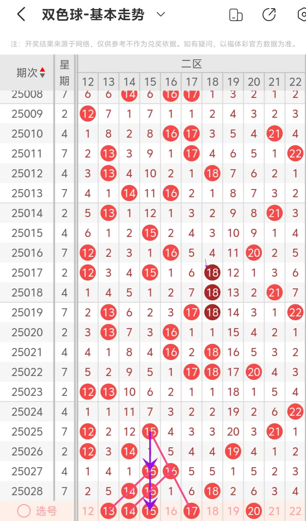 阶梯2的是:年度出现8次的:16 17号,历史出现636次的:22号。