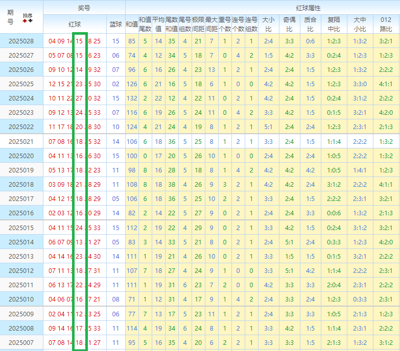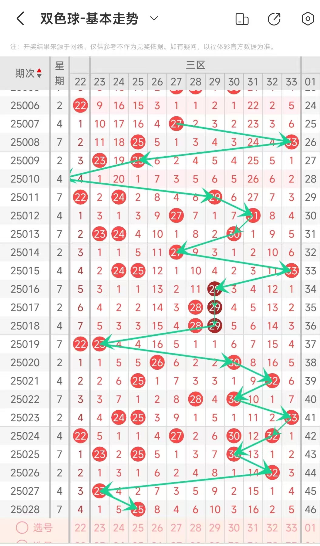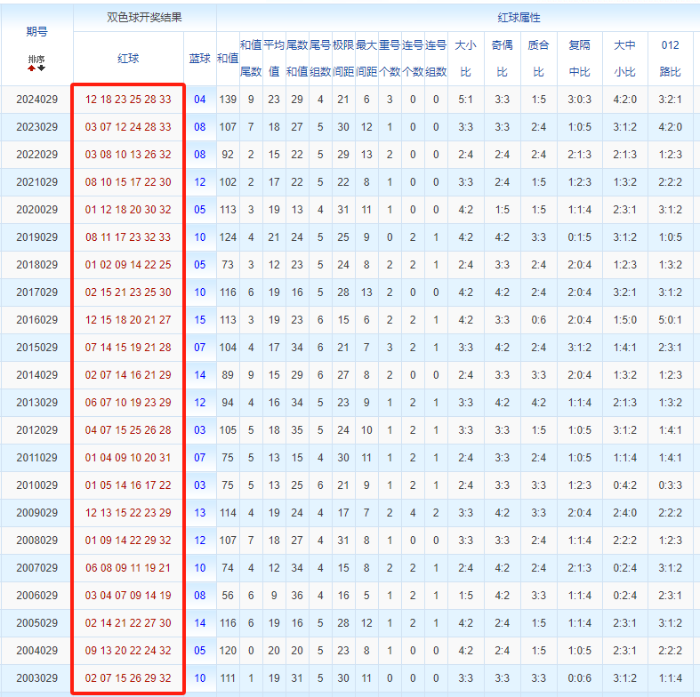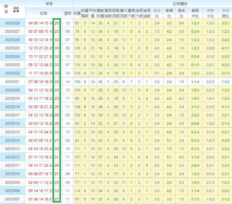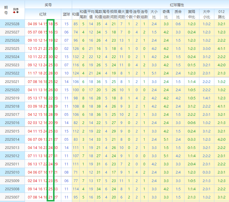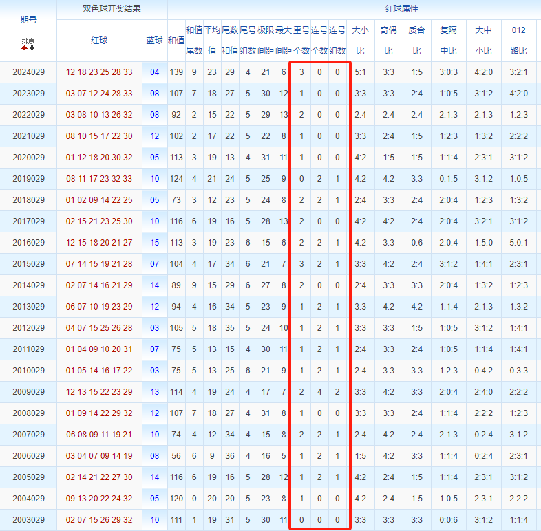 重号个数方面:重号个数1和2靠前,则重号个数推荐2个左右即12 18 23 25 28 33这6个号可能出2个