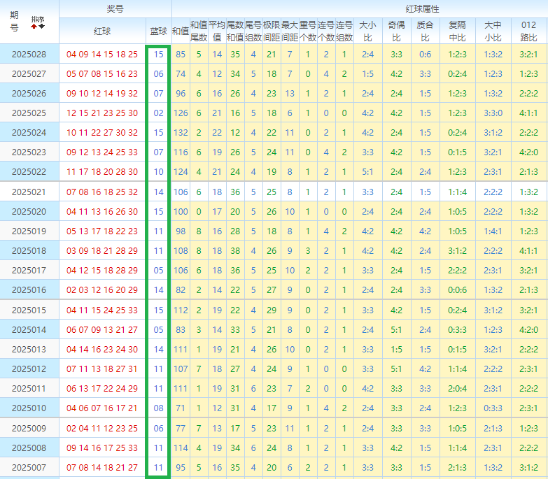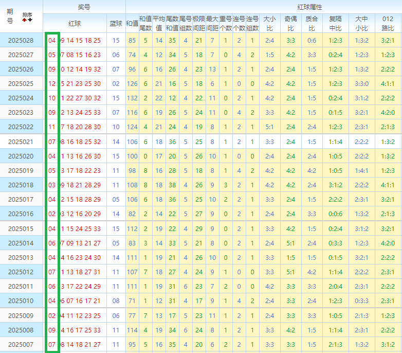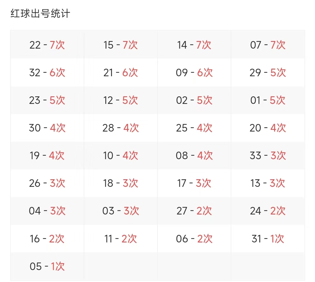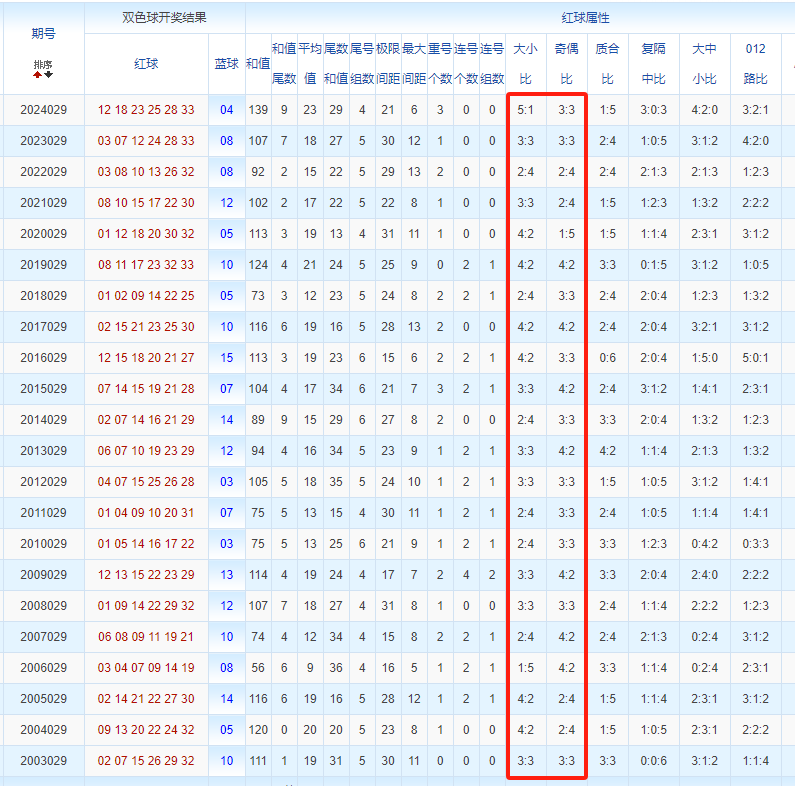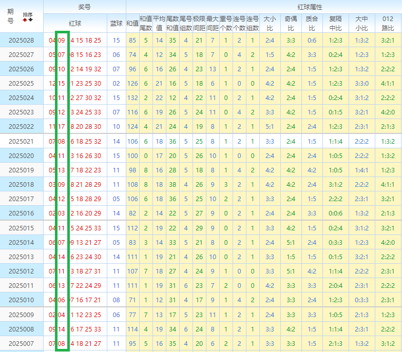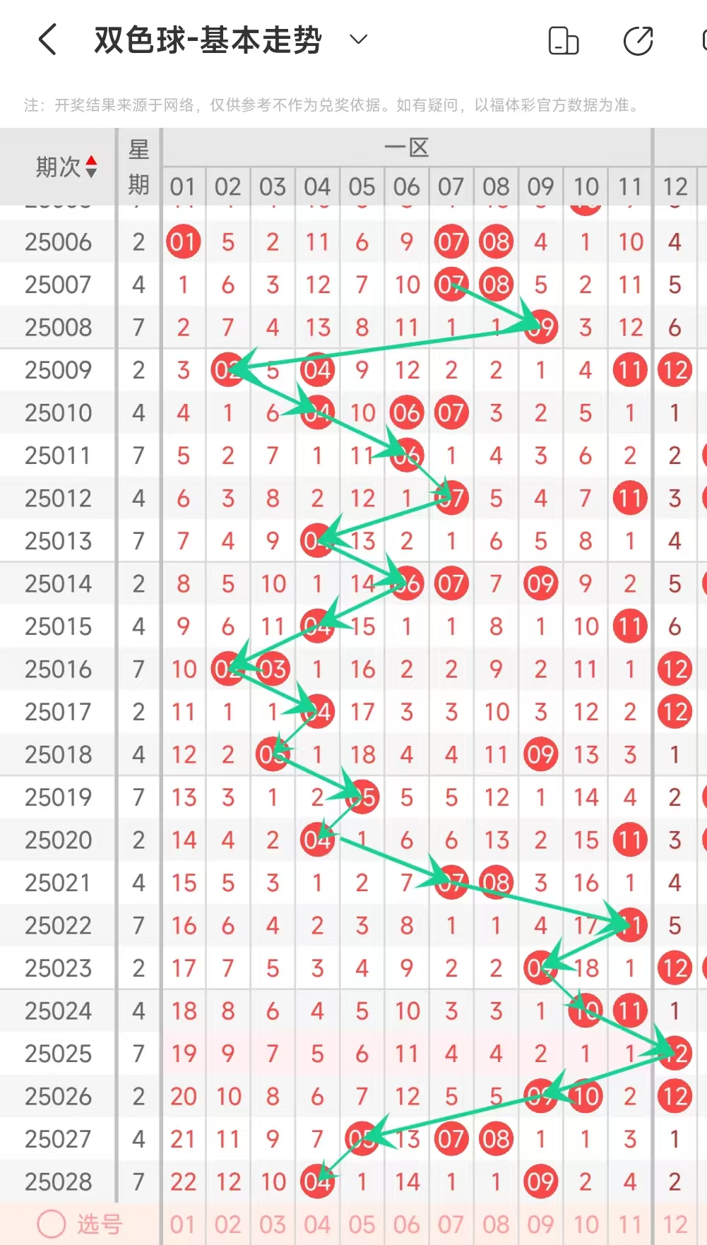 重号个数方面:重号个数1和2靠前,则重号个数推荐2个左右即12 18 23 25 28 33这6个号可能出2个